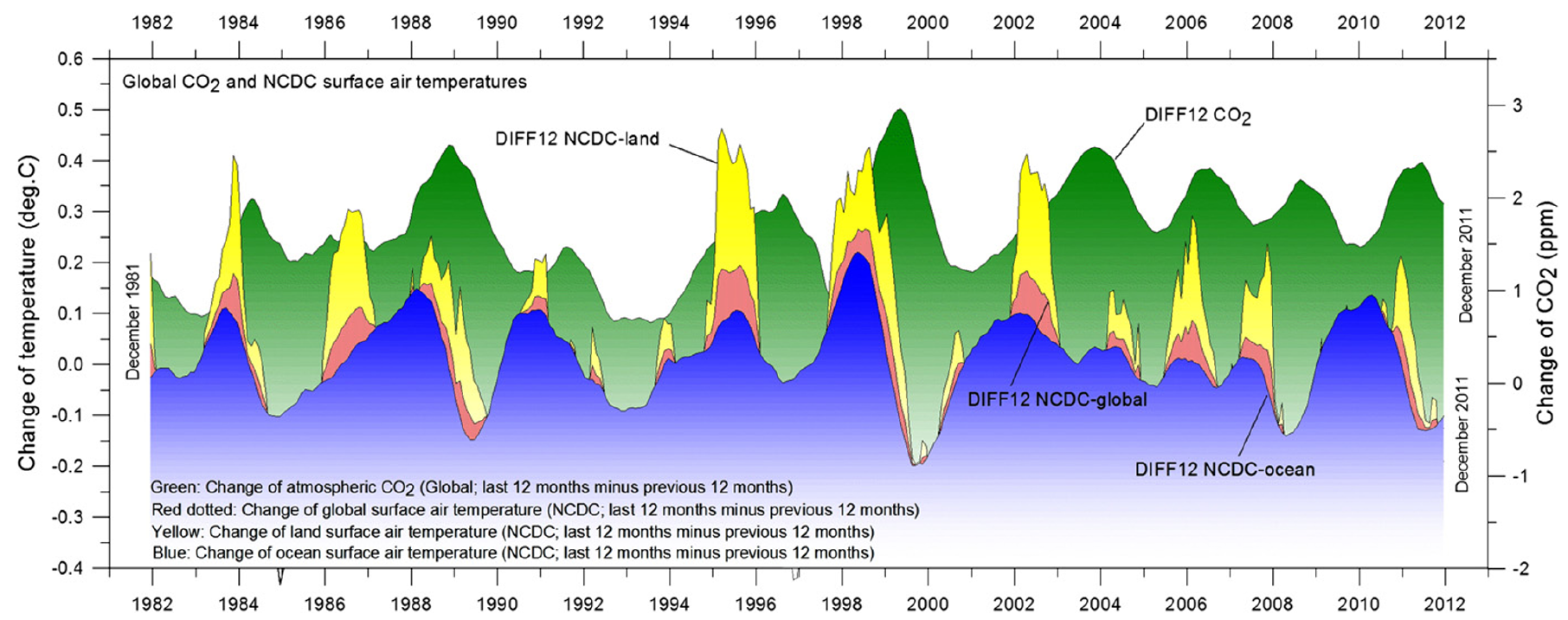 Recent research suggests that carbon dioxide levels actually follow changes in Earth’s temperature, not vice versa. 6 7 This applies to all time scales over the last (alleged) one million years. Hence it appears that temperature causes the carbon dioxide levels, not the other way around. This is explained by how the solubility of carbon dioxide in water depends upon temperature. When the temperature rises, the solubility of carbon dioxide in the oceans decreases resulting in greater amounts in the atmosphere. On the other hand, when the temperature decreases, the solubility of carbon dioxide in the oceans increases, resulting in smaller amounts in the atmosphere. On a decadal timescale, the temperature and carbon dioxide levels are depicted graphically in Figure 1.6 As can be seen, the changes in the surface temperatures on land or sea precede changes in the carbon dioxide levels.