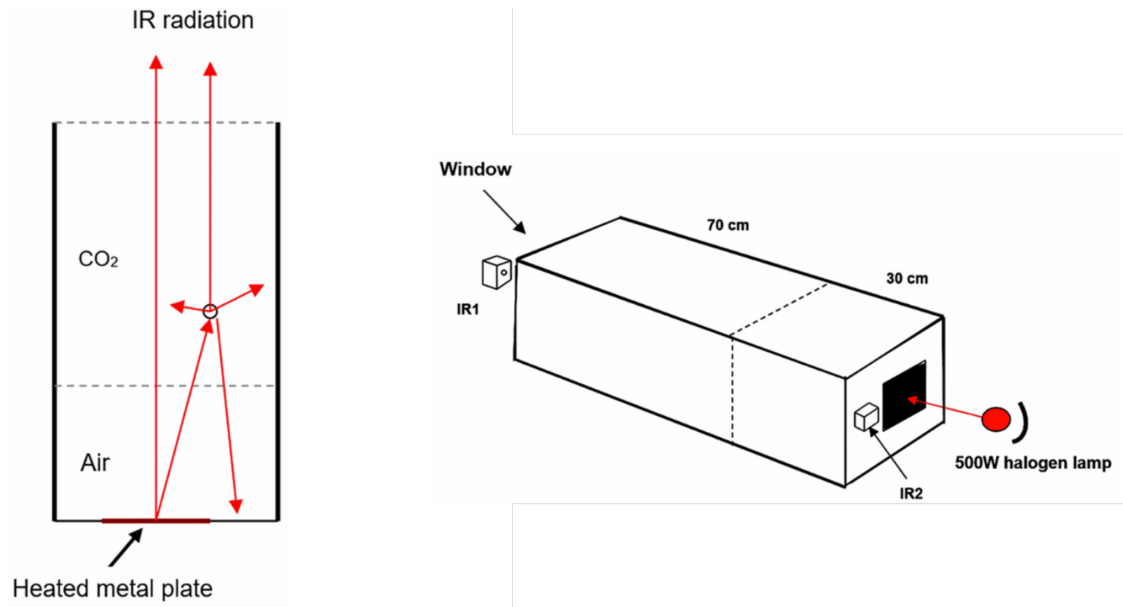 In an experimental study, researchers wanted to see if backscatter of IR radiation by carbon dioxide could account for significant greenhouse warming of the Earth’s atmosphere. 15 The Earth is warmed by radiation from the sun and then cools by emitting IR radiation. Greenhouse gases are able to absorb some of the emitted IR radiation. The absorbed radiation is then released in all directions, some into space, and some back towards the Earth. Hence greenhouse gases may slow the radiative cooling of the Earth, which could result in a net warming effect. The researchers designed experiments to determine if a significant increase in atmospheric carbon dioxide would result in a significant rise in temperature. Their experimental setup in shown in Figure 4.