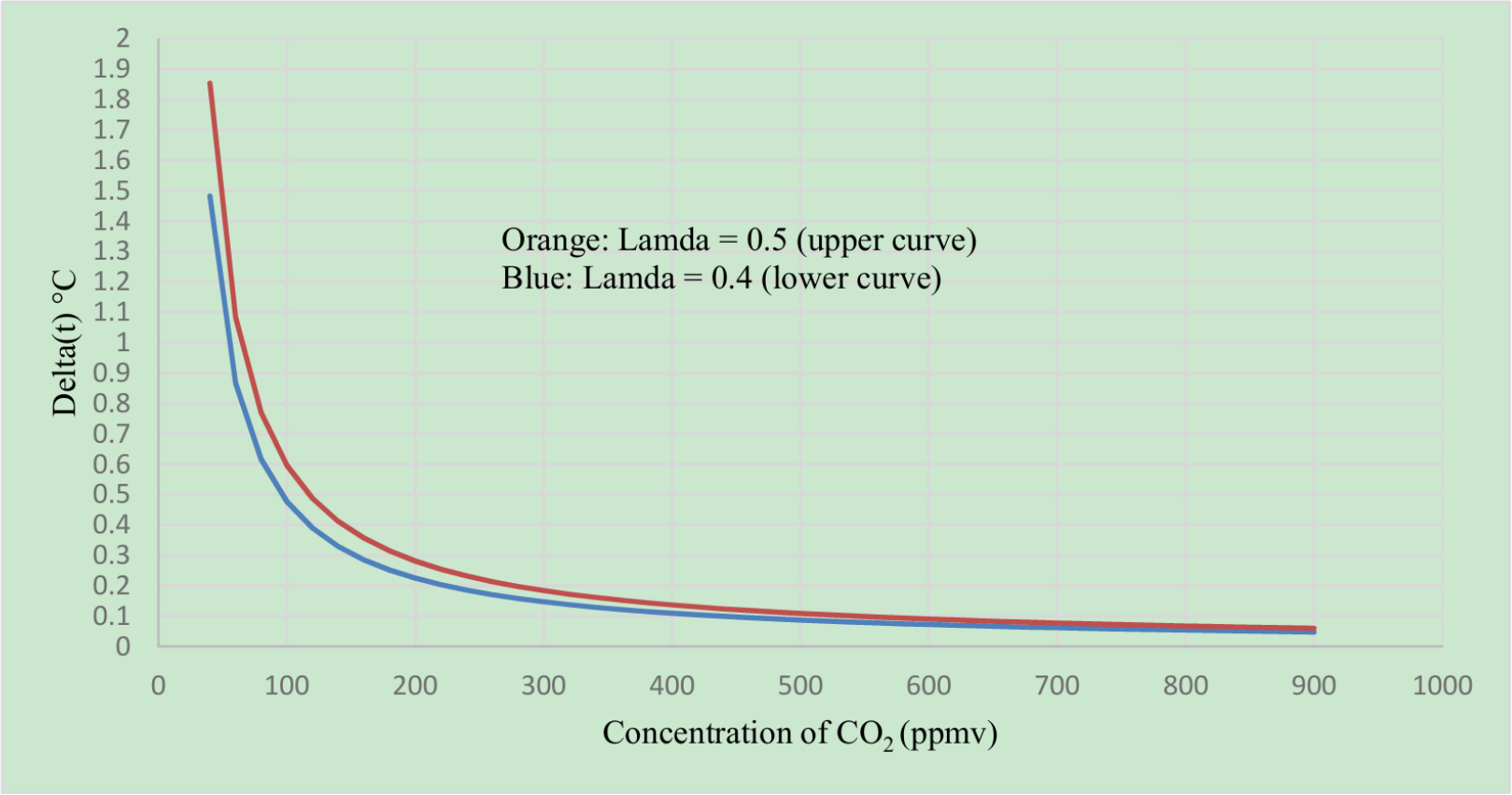Researchers have shown that the impact of increasing the carbon dioxide level on temperature decreases logarithmically as the concentration of carbon dioxide increases 8 (see Figure 2). 9