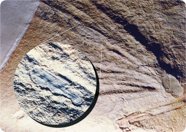 Feather imprints show what have been called “double strike” impressions. Evidently, feather impressions were made twice in a slightly displaced position as the slab and counterslab were pressed together. [See Figure 216.]